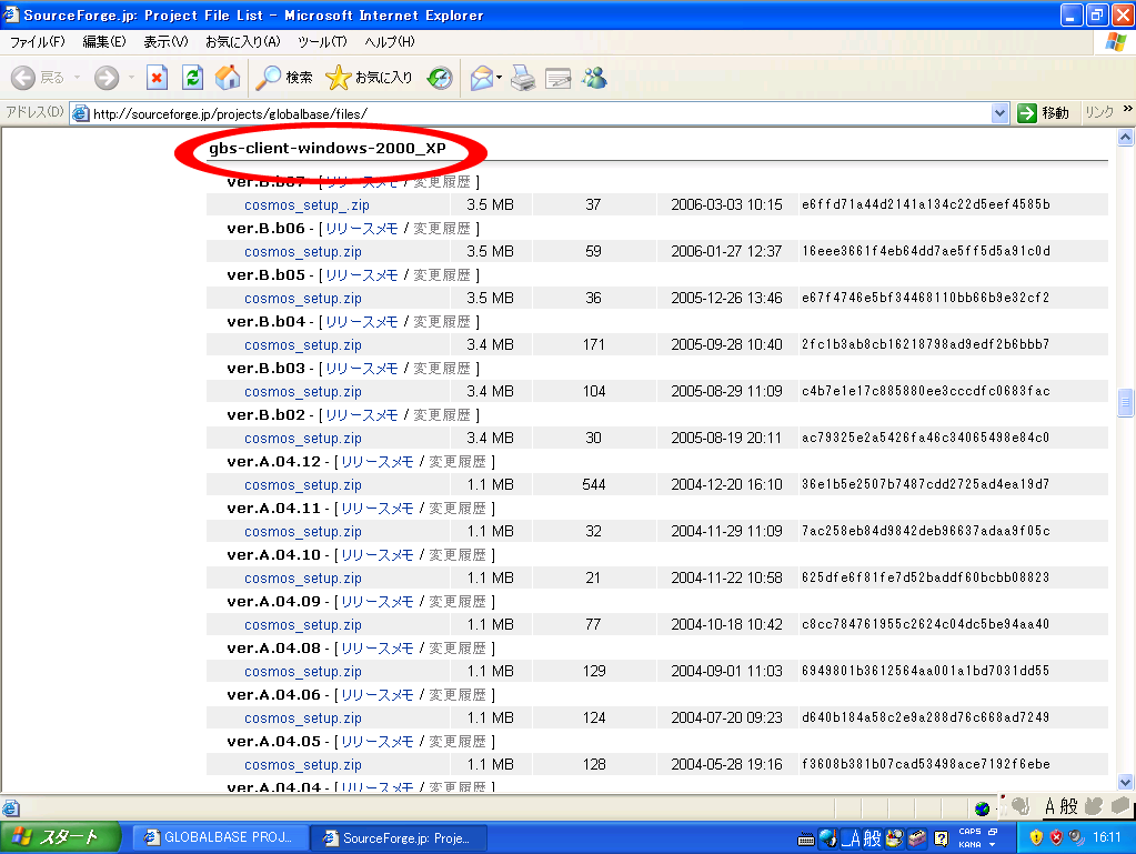 のページがWindows版のCOSMOSのインストーラのリストです。gbs-client-windows-2000_XPダウンロードタイプです。新しいバージョンから古いバージョンへの順番で並んでいますので、一番新しいバージョンをクリックしてください。以下では、ver.B.b07 cosmos_setup_.zip が最新版ですので、cosmos_setup_.zipをクリックします。
